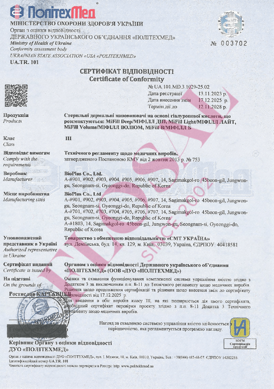 MiFill Light - м'який монофазний філер на основі стабілізованої гіалуронової кислоти. Ідеально підходить для корекції поверхневих зморшок, заломів і борозен шкіри. Рівномірно розподіляється в тканинах, не утворює грудок, забезпечує повноцінну корекцію протягом 10-12 місяців.